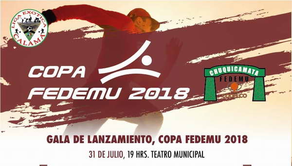 Este 31 de julio, a las 19 horas, en el Cine Municipal de Calama será la Gala de Lanzamiento de la COPA FEDEMU 2018 que se desarrollará entre el 31 de julio y el 25 de agosto para incentivar el deporte y la recreación en los habitantes de la provincia El Loa.