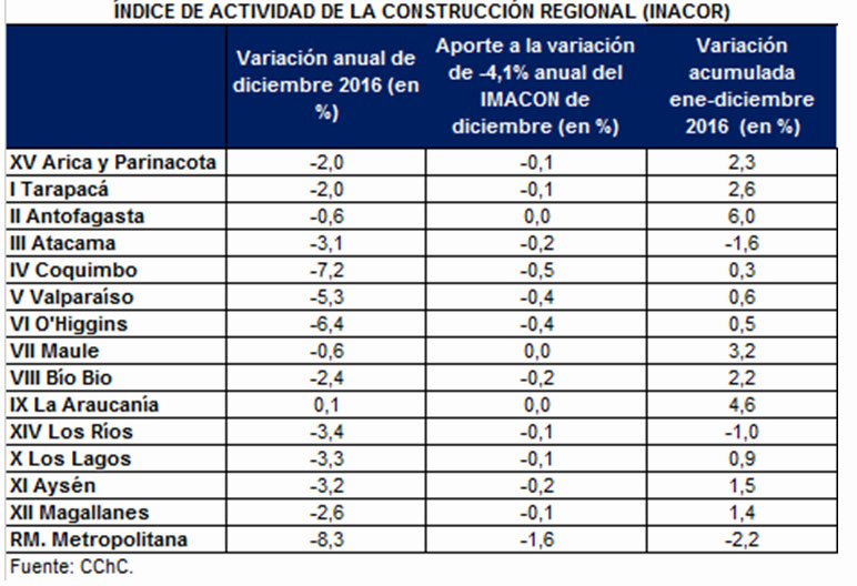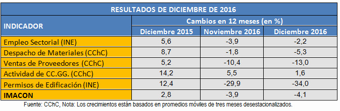 El Índice Mensual de Actividad de la Construcción (IMACON), elaborado por la Cámara Chilena de la Construcción (CChC), exhibió una caída anual de 4,1% durante diciembre de 2016. Cifra que continúa profundizando el descenso registrado el mes anterior (3,9) siendo estos valores los más bajos de la actividad sectorial de los últimos siete años, cuando en noviembre de 2009, y por efecto de la crisis subprime, la actividad de la construcción registró un retroceso de 3,8% en doce meses.