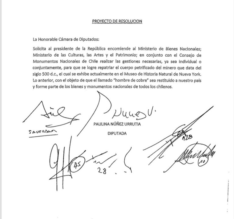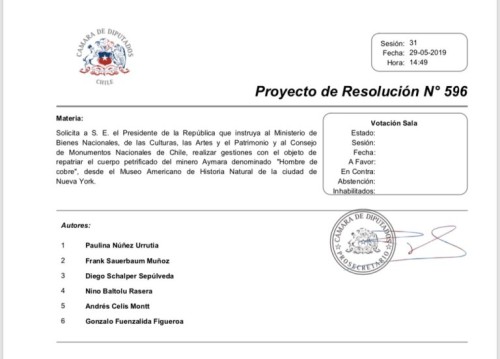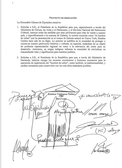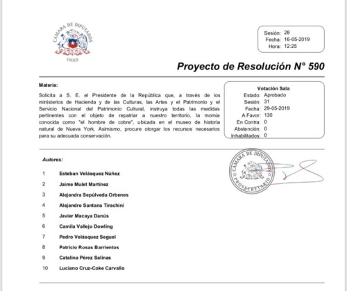 Desde la oficina de prensa del diputado Velásquez señalaron que efectivamente el parlamentario presentó una iniciativa que busca «la repatriación del Hombre de Cobre y la disposición de todo lo necesario para su conservación en Calama, el día 16 de mayo».