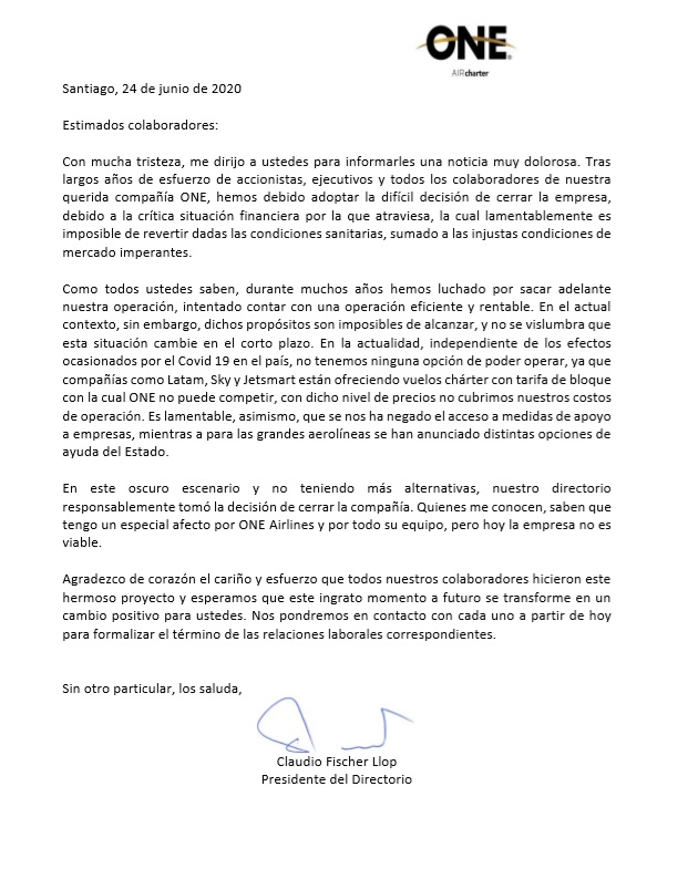 One Airlines, compañía chilena especializada en vuelos chárter para el sector minero, anunció el cierre de sus operaciones debido a la crisis financiera y las condiciones actuales del mercado.