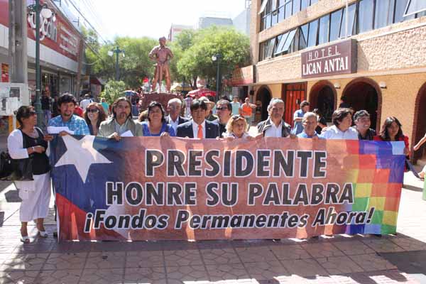 Este lunes el alcalde de Calama, Esteban Velásquez, y la Asamblea Ciudadana de la ciudad llegaron hasta el Paseo Ramírez con un vistoso letrero, consignando “Presidente honre su palabra… ¡Fondos permanentes ahora!”. En la oportunidad, leyeron una declaración, respondiendo a Sebastián Piñera, quien la noche del domingo, en el Programa Tolerancia Cero de Chilevisión, se refirió al conflicto en Calama, despertando aún más molestia en los loínos, toda vez que no hizo mención a la principal demanda calameña.