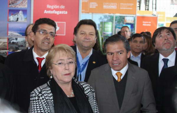 La cartera de 24 proyectos emblemáticos fue explicada por el Intendente Volta a la Presidenta Bachelet, quien permaneció varios minutos en el stand de Antofagasta, donde se le dio la bienvenida con folclore representado por Margarita Chocobar, de San Pedro de Atacama.