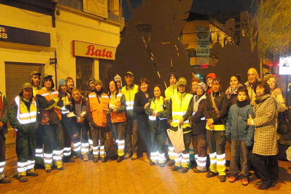 En plena intersección de las calles Prat con Matta y junto al monumento que recuerda la figura del sacerdote jesuita fundador del Hogar de Cristo, cada uno de los trabajadores de la empresa Paisajismo Cordillera, que muy temprano se reúnen en el lugar antes de iniciar su jornada laboral, recibieron de manos los apoderados una rica bandeja con torta y dulces, la cual acompañaron de un rico café o té.