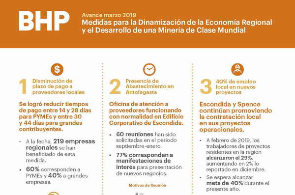• El área de abastecimiento de BHP ha consolidado su presencia en la región a través de la Oficina de Atención a Proveedores ubicada en el Edificio Corporativo de Escondida en Antofagasta. A la fecha se han agendado 60 reuniones con empresas locales, un 77% de las cuales están relacionadas con la búsqueda de oportunidades de nuevos negocios.