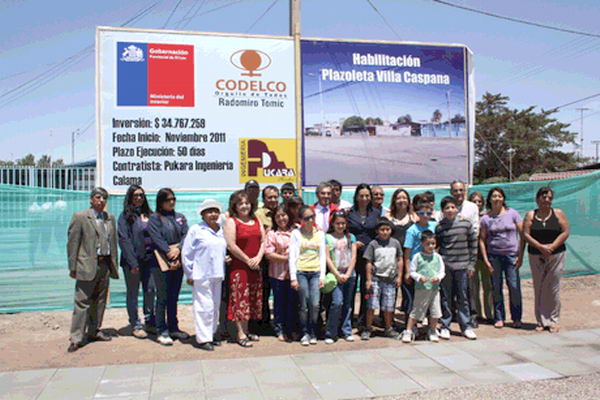 Satisfacción y alegría fue el síntoma que evidenciaron vecinos de los sectores de la Junta de Vecinos Sol Divino y de villa Caspana, luego de que el gobernador provincial, Luís Garrido, y la gerenta de Sustentabilidad y Asuntos Públicos de Codelco Radomiro Tomic, Rebeca Sanhueza, hicieran una visita de obra a dos, de las plazoletas activas que pronto serán entregadas para su uso comunitario.