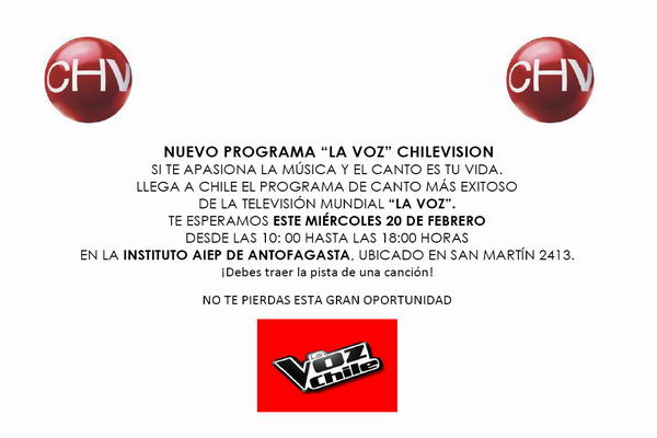 En este momento nos encontramos realizando una gira por el norte, donde estaremos en Antofagasta este 20 de febrero en el Instituto AIEP(San Martín 2413), desde las 10 a 18:00 hrs. Llevar pista del tema a interpretar