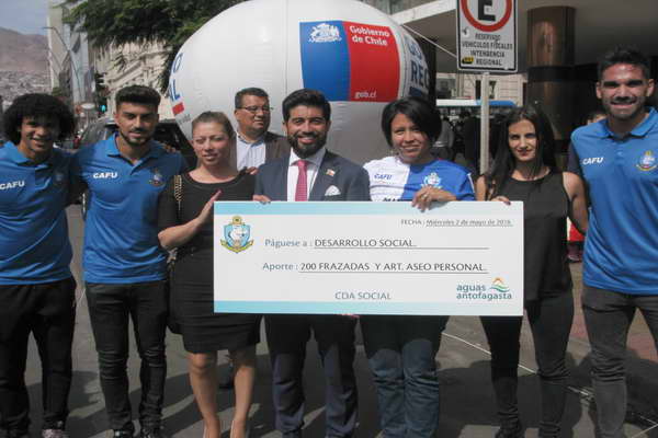 Un enorme cheque con el aporte de 200 frazadas marcó la primera donación del CDA y Aguas Antofagasta a la Campaña de Invierno, impulsada por la Seremi de Desarrollo Social.