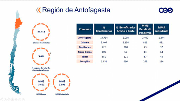 CGE, empresa que presta servicio de distribución eléctrica a las comunas en zona de concesión de la Región de Antofagasta, comenzó el proceso de implementación de la Ley de Subsidio y Prorrateo de deudas por Servicios Básicos generadas durante la pandemia de Covid-19 y que establece subsidios en sus cuentas eléctricas para clientes vulnerables, Ley N° 21.423.