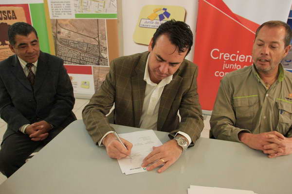 Claudio Olguín, gerente general de División Ministro Hales, y representantes del Complejo Habitacional Tucnar Huasi, materializaron la firma de un convenio que permitirá concretar el Fondo de Inversión Social (FIS) Corporativo asociado a la instalación de energía Termosolar en el conjunto habitacional, convirtiendo a Tucnar Huasi en la primera villa verde de Calama.