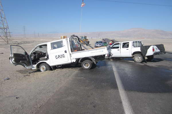 Dos conductores heridos de diversa consideración fue el resultado de una colisión frontal en el kilómetro 9 de la ruta B 262, cuando dos camionetas pertenecientes a empresas de la comuna colisionaron de frente. El hecho provocó una gran congestión vehicular que fue rápidamente controlada por carabineros de la Tenencia Mejillones.