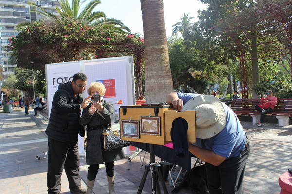 “Yo pasaba por acá con mi mamá, que me llevaba donde está la PDI que antes era la pulpería, pero como me aburría, me venía a la plaza y veía a los viejitos tomando fotos con esas cajas, lo que para mí era maravilloso. Me quedé con ese bichito y decidí con el pasar de los años traspasar mi sabiduría y experiencia al cajón” cuenta el fotógrafo Ricardo de la Peña.