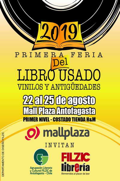 De igual forma, este 22, 23, 24 y 25 de Agosto, al interior del Mall Plaza Antofagasta, tendrá lugar la primera “Feria del libro usado, vinilo y antigüedades”, instancia nueva y novedosa que pretende consolidar un espacio en el programa de actividades culturales de la ciudad, evento que en palabras del director ejecutivo de Filzic, Patricio Rojas, “gracias a la voluntad del Mall Plaza Antofagasta, podemos poner a disposición de la comunidad, un espacio donde fortaleceremos la oferta literaria a precios accesibles a todos los bolsillos, con libros clásicos, de aventuras, best Seller, infantiles y muchos más, los cuales sumados a la presencia de vinilos de variado precio y antigüedades, otorgan un sello propio y particular a esta apuesta, la que queremos sea la impronta del mismo hacia adelante”, agregando que “pretendemos replicar esta actividad en varias comunas de la región, y aspiramos a que tenga una acogida tal, que se convierta en uno de los imperdibles de cada año”.