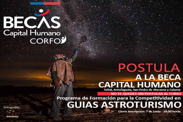 En el marco del Programa Becas Capital Humano de Corfo, y con el respaldo de la Mesa Regional de Astroturismo, se desarrollarán en los próximos meses el Programa de Formación para la Competitividad (PFC) en Guías de Astroturismo, el cual está dirigido a trabajadores que se desempeñen en actividades productivas relacionadas a este mercado en las comunas de Antofagasta, Taltal, Calama y San Pedro de Atacama.