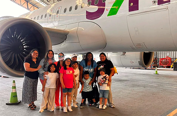Tras un recorrido guiado por la plataforma y las pistas del aeropuerto, los niños y niñas conocieron los protocolos de seguridad del aeropuerto a través de una demostración del Servicio de Salvamento y Extinción de Incendios de la DGAC. Luego visitaron la base de mantenimiento de SKY, donde pudieron conocer de cerca el trabajo que se realiza en los talleres de motores y ruedas de las aeronaves.