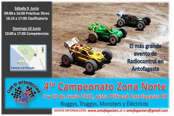 El Club Deportivo AntofagastaRC, realizará el 9 y 10 de junio su Cuarto Campeonato Zona Norte de Automodelismo Radiocontrolado, a desarrollarse en la pista ubicada camino a La Portada a metros de la bifurcación hacia el balneario Juan López, el cual contará con la participación de pilotos de Iquique, Calama, Copiapó y locales, con el fin de competir en las categorías Buggy, Truggy, Monster y Eléctricos.