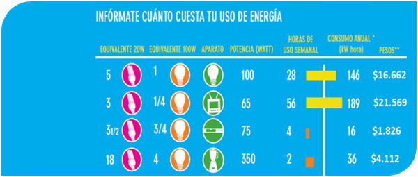 Agregó que una ampolleta eficiente de 20 Watts ilumina lo mismo que una ampolleta común de 100 Watts pero gasta 5 veces menos, en decir, la iluminación con ampolleta corriente es 5 veces más cara que la de una ampolleta tradicional. El usuario obtendrá un ahorro real en su cuenta mensual y colaborará en la reducción de emisiones tóxicas.