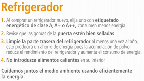 Abrir el refrigerador sólo cuando sea necesario. Si se necesita sacar varios alimentos de éste, hacerlo de una sola vez, ya que el refrigerador es el artefacto que más energía gasta dentro del hogar y cada vez que se abre pierde refrigeración y debe utilizar energía para recuperarla.