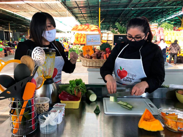 En pleno patio del recinto agropecuario y en un mesón adornado con frutas y verduras, la chef Milissen Fernandois y la nutricionista Yanara Orellana entregaron útiles consejos a los clientes, comerciantes y televidentes, quienes siguieron atentamente la preparación de los alimentos y conocieron las propiedades de éstos.