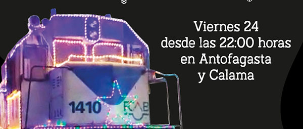 Este 24 de diciembre cuando el reloj marque las 22:00 horas, dos locomotoras iluminadas de colores iniciarán sus recorridos por las comunas de Calama y Antofagasta.