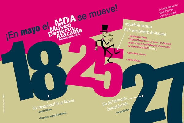 Por último, el domingo 27 de mayo el Museo Desierto de Atacama se sumará a las celebraciones del Día del Patrimonio Cultural en Chile, donde todos los edificios patrimoniales y espacios públicos del país abren sus puertas gratuitamente para que una gran cantidad de público pueda conocerlos, recorrerlos y disfrutarlos.