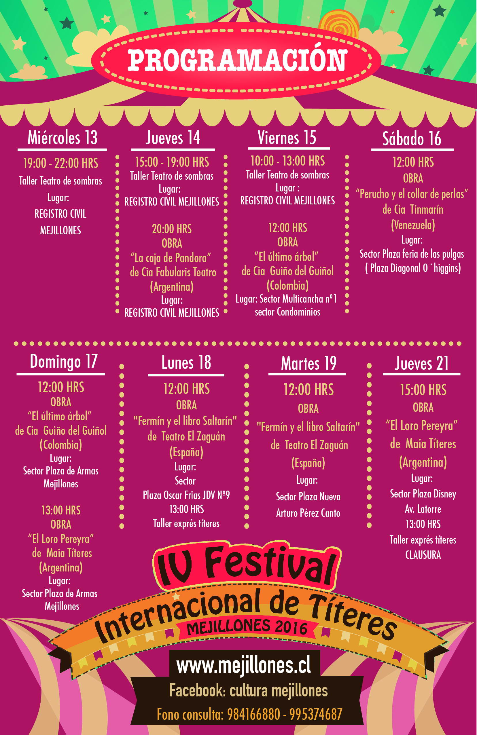 El festival se desarrollará entre el 13 y el 21 de julio, presentándose cinco obras: La caja de pandora de la compañía argentina Fabularis Teatro, El último árbol de la compañía colombiana Guiño del Guiñol, Perucho y el collar de perlas de la compañía venezolana Tinmarín, El loro Pereyra de la compañía argentina Maia Títeres, y “Fermín y el libro saltarín” de la compañía española Teatro El Zaguán. Además, se realizarán talleres de la disciplina para quienes estén interesados en aprender este ancestral arte escénico.