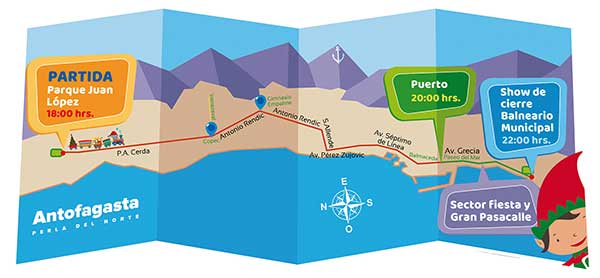 Se trata de cuatro camiones ornamentados con temáticas de Frozen, Cars, Fábrica de Juguetes y un carro navideño con el Viejito Pascuero, que partirán su recorrido a las 18 horas desde el Parque Juan López para llegar al sector del Puerto de Antofagasta a las 20 horas, desde donde se iniciará una comparsa llena de luces, color, música y magia, en cuatro estaciones con diversas actividades como juegos inflables, recorridos en tren y en moto.