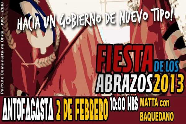 Como es tradicional el Partido Comunista (PC), cada año realiza la fiesta de los abrazos, tanto a nivel nacional, regional y local, pero este año 2013 por primera vez en Antofagasta se efectuará en la calle, dejando atrás la actividad efectuada en el local partidario, y es porque celebran su centenario y a 39 años de Historia han vuelto al Municipio.
