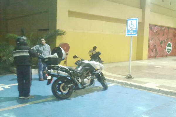 Aquí hay un Motociclista INVALIDO, o sea, no es válido donde se estaciona y no le importa mucho. Jumbo Punto de Encuentro Antofagasta.