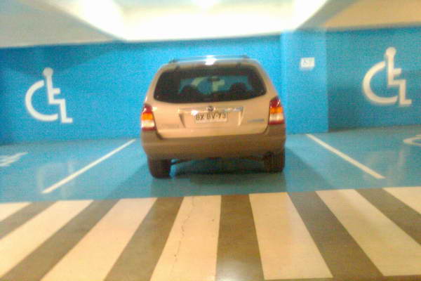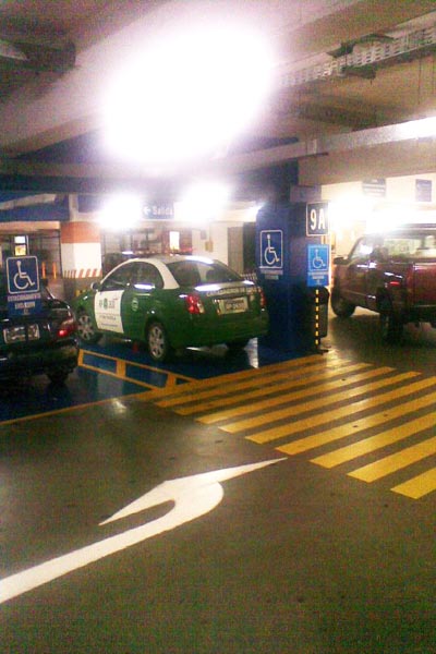 Fotos tomadas este domingo en el Jumbo Punto de Encuentro, nadie respeta los estacionamientos para misnusválidos, embarazadas o tercera edad. Tampoco nadie portaba la cruz de malta en sus vidrios. Tampoco se visualiza un guardia haciendo respetar esta situación.