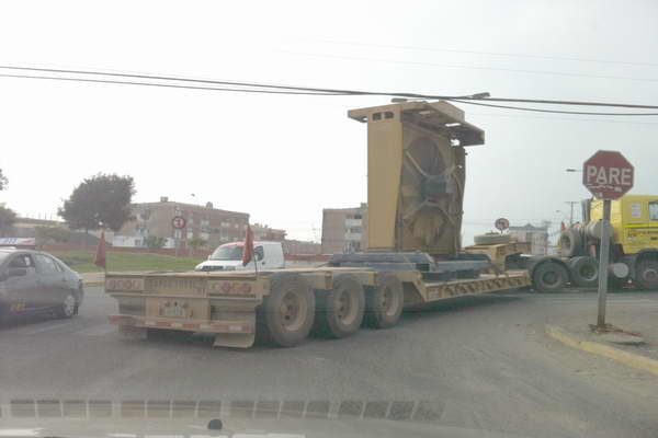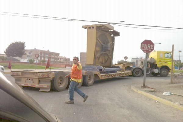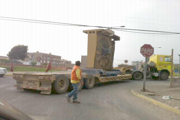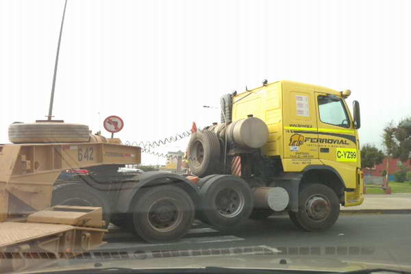 Camión de la empresa FERROVIAL con carga de alto volumen y peso a la vista, transita en calle el Oro con Nicolás Tirado sin guías ni carabineros el chofer se baja para ver si puede pasar por que está tocando los cables.