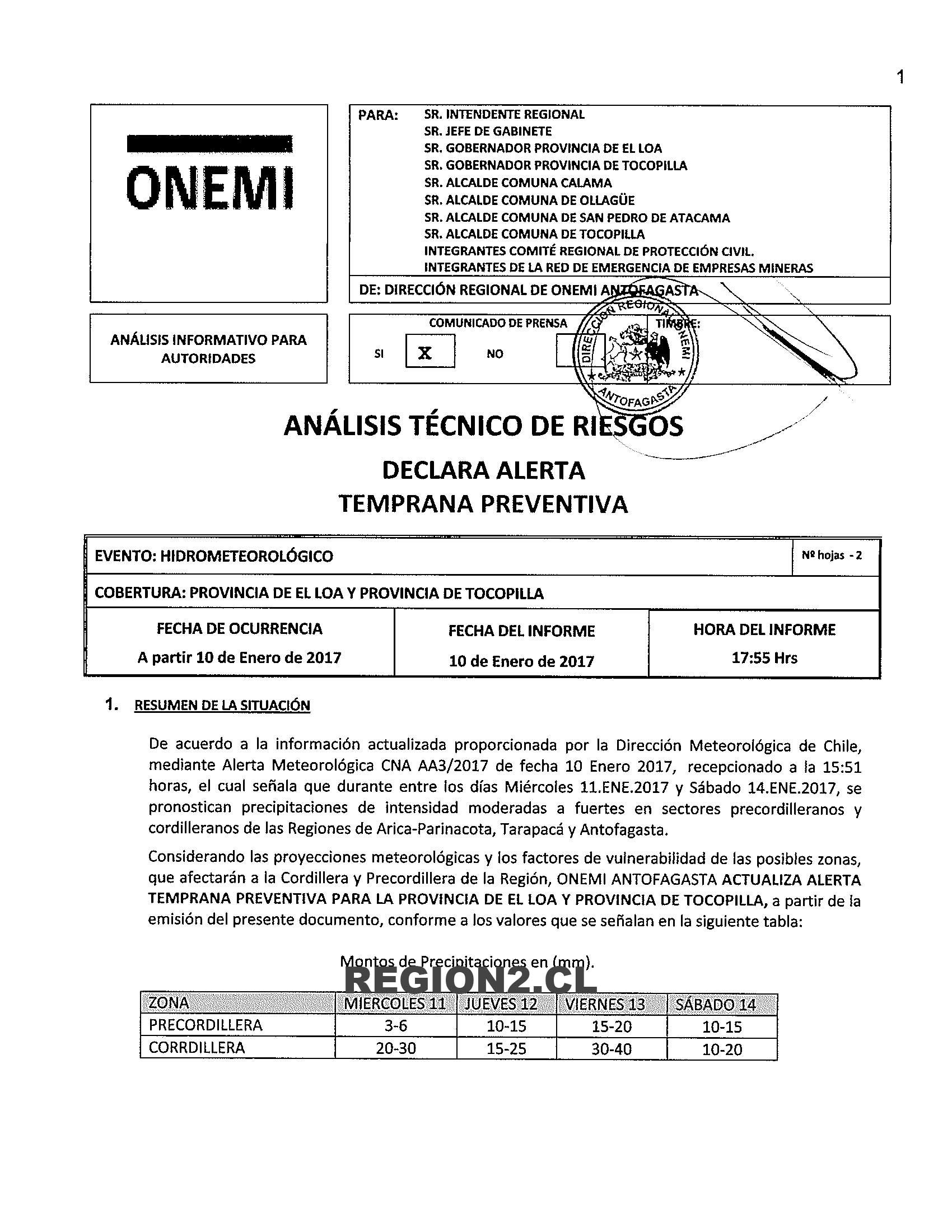 “Hemos instruido al Gobernador de El Loa, con ONEMI se coordina con los alcaldes de Ollague, San Pedro y Calama, con el objetivo de asumir los resguardos pertinentes. Estamos monitoreando la alerta temprana preventiva por los anuncios de lluvias anunciadas para la pre y cordillera de nuestra Región de Antofagasta”.