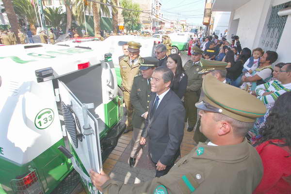 En la oportunidad, se entregaron 13 primeros furgones, aportadas por el Gobierno Regional y cuatro motos provenientes del nivel central de Carabineros.