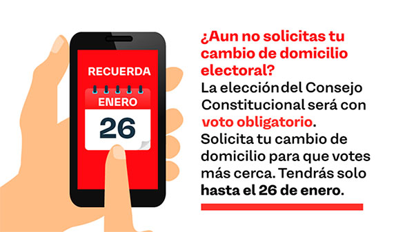 Este 26 de enero a las 23:59 horas vence el plazo para solicitar el cambio del domicilio electoral registrado, así como cualquier modificación y actualización al Registro Electoral, con miras a la elaboración del padrón para la próxima elección de los miembros del Consejo Constitucional del 7 de mayo.