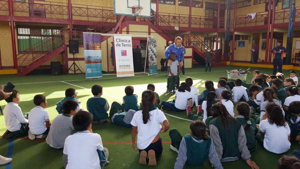 Mejillones, mayo 2015.- En el marco de la Escuela de Tenis Puerto Mejillones, iniciativa que es llevada adelante por el terminal portuario en conjunto con la Municipalidad de Mejillones y Horacio de la Peña, el ex tenista visitó este martes 26 de mayo la Escuela María Angélica Elizondo y el Complejo Educacional Juan José Latorre, ambas instituciones ubicadas en la comuna.