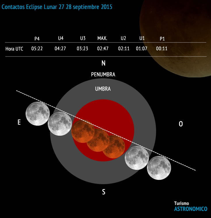 En el siguiente gráfico y tabla se indican los horarios UTC en que se irán produciendo todos los contactos del eclipse total de Luna del 27 al 28 de septiembre del 2015.