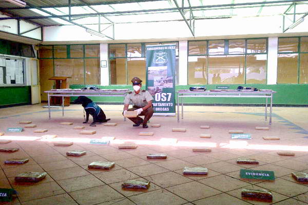 Cabe destacar que en lo que va corrido del año, el can detector de drogas “Moro”, color negro, raza labrador retriever y con 2 años y 8 meses de servicio en Carabineros de Chile, ha apoyo la incautación de 126 kilos, 205 gramos de marihuana y 22 kilos, 265 gramos de pasta base de cocaína, lo que ha permitido la detención de 4 personas (dos chilenos y dos colombianos)