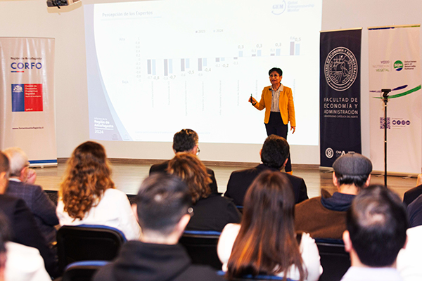 La encargada de presentar los resultados fue la Dra. Gianni Romaní, investigadora principal y coautora del informe GEM Región de Antofagasta 2024, quien hizo una amplia y exhaustiva revisión de los indicadores, advirtiendo una positiva evolución del emprendimiento en general.