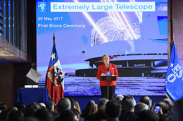 La Presidenta de la República de Chile, Michelle Bachelet Jeria, asistió hoy a la ceremonia de primera piedra del Extremely Large Telescope de ESO (ELT). El evento tuvo lugar en el cercano Observatorio Paranal de ESO, en el norte de Chile. Este hito marca el comienzo de la construcción de la cúpula y estructura del telescopio óptico más grande del mundo, dando inicio a una nueva era en la astronomía. Asimismo, el evento celebró la conexión del observatorio a la red de suministro eléctrico de Chile.