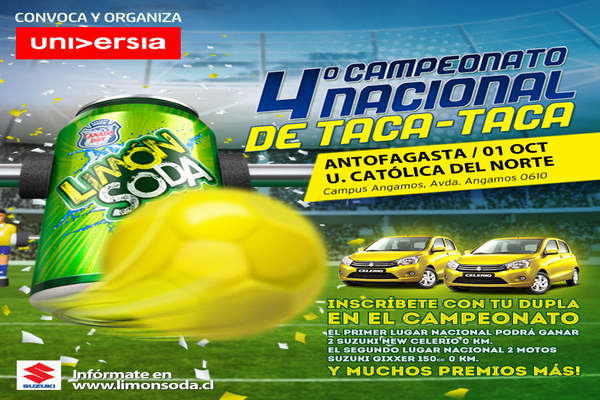 A contar de las 11:00 AM de este jueves 1° de octubre, en el Campus Angamos (Avda. Angamos 0610) la Universidad Católica del Norte, se llevará a cabo la etapa clasificatoria zonal del IV Campeonato Nacional de Taca Taca Universia Limón Soda 2015, evento en el cual pueden participar los alumnos de todas las instituciones socias de la red en Antofagasta e integrantes de la ciudad que gusten de este juego.