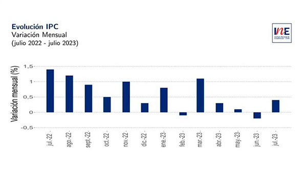 El Instituto Nacional de Estadísticas (INE) anunció que durante el mes de julio de 2023, el Índice de Precios al Consumidor (IPC) experimentó un aumento del 0,4%. Esto resulta en un incremento acumulado del 2,5% en lo que va del año, mientras que la variación a lo largo de los últimos doce meses se situó en un alza del 6,5%.