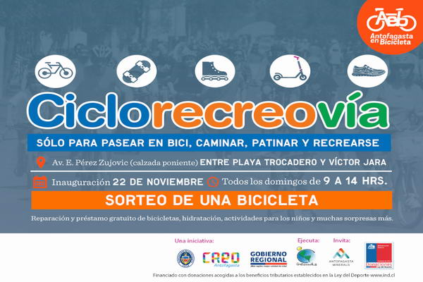 A partir del domingo 22 de noviembre Antofagasta se pondrá en movimiento a través de un innovador proyecto de CicloRecreoVía, el que busca fomentar el uso de la bicicleta y recuperar espacios públicos para hacer deporte, recrearse y propiciar el encuentro ciudadano.