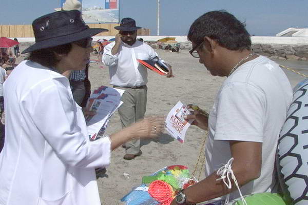 La Seremi de Salud (s), Pasme Seleme, provista de un sombrero y de lentes para protegerse de los rayos ultravioleta, entregó información y bloqueadores a las decenas de bañistas que disfrutaban del soleado día en la popular playa de la capital regional.