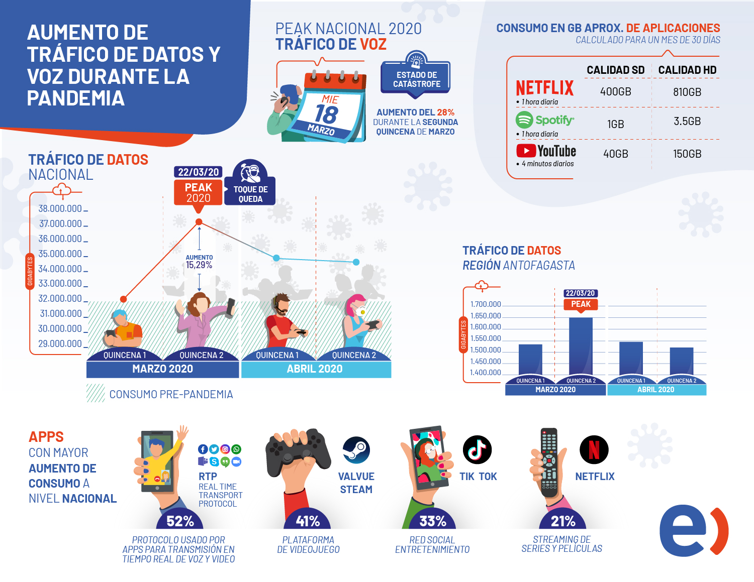 Asimismo, de acuerdo al análisis hecho por Entel, las aplicaciones móviles cuyo tráfico más creció a nivel nacional una vez decretado el estado de catástrofe son, en primer lugar, Real-Time Transport Protocol (aplicación confiable para transmitir voz y videos), con un 52%; segunda se ubica Valve Steam (plataforma de videojuegos en streaming) con 41%, tercera se encuentra la popular TikTok con 33%, y con un 21% la aplicación Netflix.
