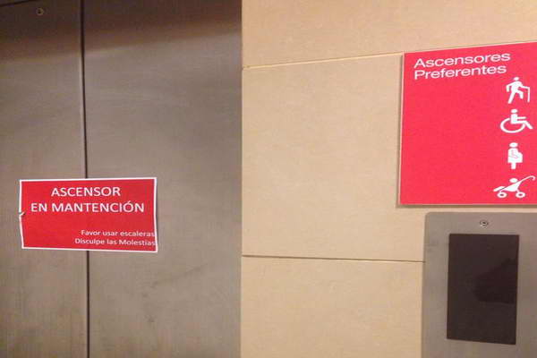 Al llegar al sector de ascensor vimos con frustración que este se encontraba en MANTENCION. En forma paralela el ascensor de MONTACARGA también se encontraba en MANTENCION. Como nuestro hijo aún se encuentra movilizándose en silla de ruedas era IMPOSIBLE BAJARLO AL SEGUNDO O PRIMER PISO. Algunas personas de muy buena disponibilidad se ofrecieron para ayudar a bajarlo a los pisos inferiores, pero creo que esa no era la idea ya que se podía caer y accidentarse. Un par de señoritas fueron a buscar ayuda y llegaron un par de guardias del mall.