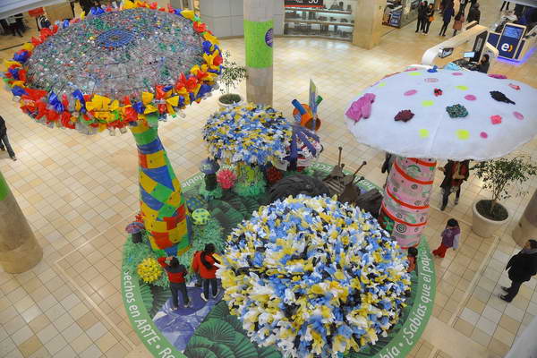 Luego, los visitantes podrán disfrutar de imponentes jardines elaborados con material reciclado, los que vestirán las plazas centrales de los malls. Por ejemplo, en Mall Plaza Oeste habrá uno con dientes de león elaborados con estructuras de paraguas, plumeros y pelotas de pingpong; habrá chanchitos de tierra hechos de caucho, acero y bolsas plásticas; también arbustos de botellas recicladas y plantas decorativas de virutillas.