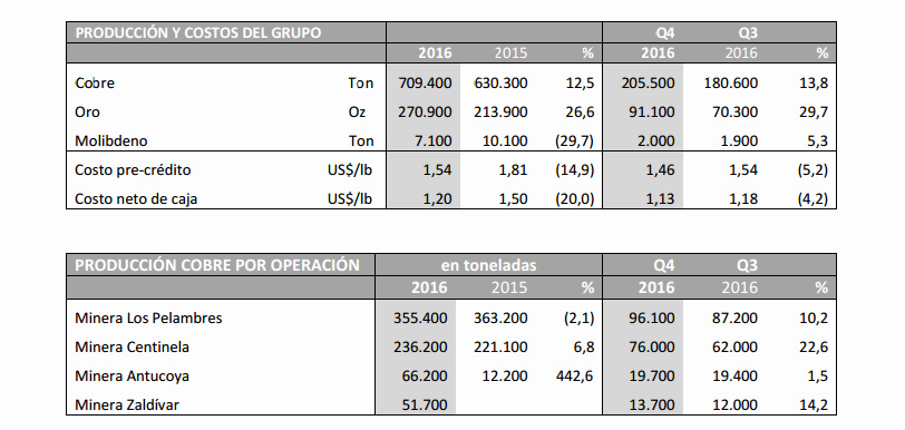 La compañía logró más de 709 mil toneladas de cobre en 2016 gracias a la puesta en marcha de Minera Antucoya, a la integración de Minera Zaldívar y a una mayor producción en Minera Centinela.