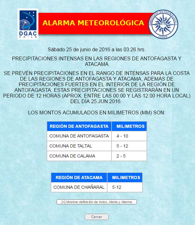METEOROLOGIA DECRETA ALARMA METEOROLOGICA PARA REGIONES DE ANTOFAGASTA Y ATACAMA