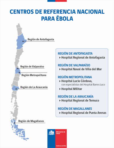 La Ministra de Salud señaló que “al igual que la mayoría de los países que hoy día están preparados para recibir sospechosos, hemos centralizado en algunos establecimientos del país todas las condiciones y toda la infraestructura e insumos que se requieren en estos casos”. Los establecimientos asistenciales definidos para estos fines, de norte a sur, son el Hospital de Antofagasta; el Hospital Naval de Viña del Mar; el Hospital Lucio Córdova y el Hospital Militar, en Santiago; el Hospital Regional de Temuco; y el Hospital Regional de Punta Arenas.