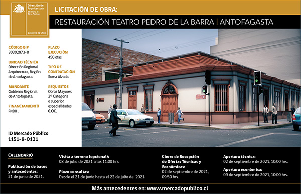 Con el objetivo de realizar las obras de restauración del teatro Pedro de la Barra de Antofagasta, el Ministerio de Obras Públicas a través de la Dirección Regional de Arquitectura, publicó el llamado a licitación de este importante proyecto de rescate de infraestructura patrimonial que se ubica en el corazón de la ciudad.