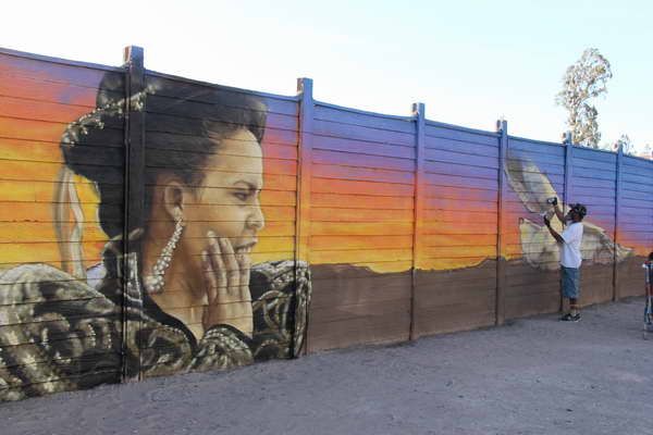 La pintura en cada metro refleja los colores, historias y paisajes que recorre el tren desde Calama a Ollagüe, más de 200 kilómetros de línea férrea que un convoy transita durante ocho horas y aquí se plasman en 180 metros de extensión del muro que bordea el recinto del Ferrocarril.